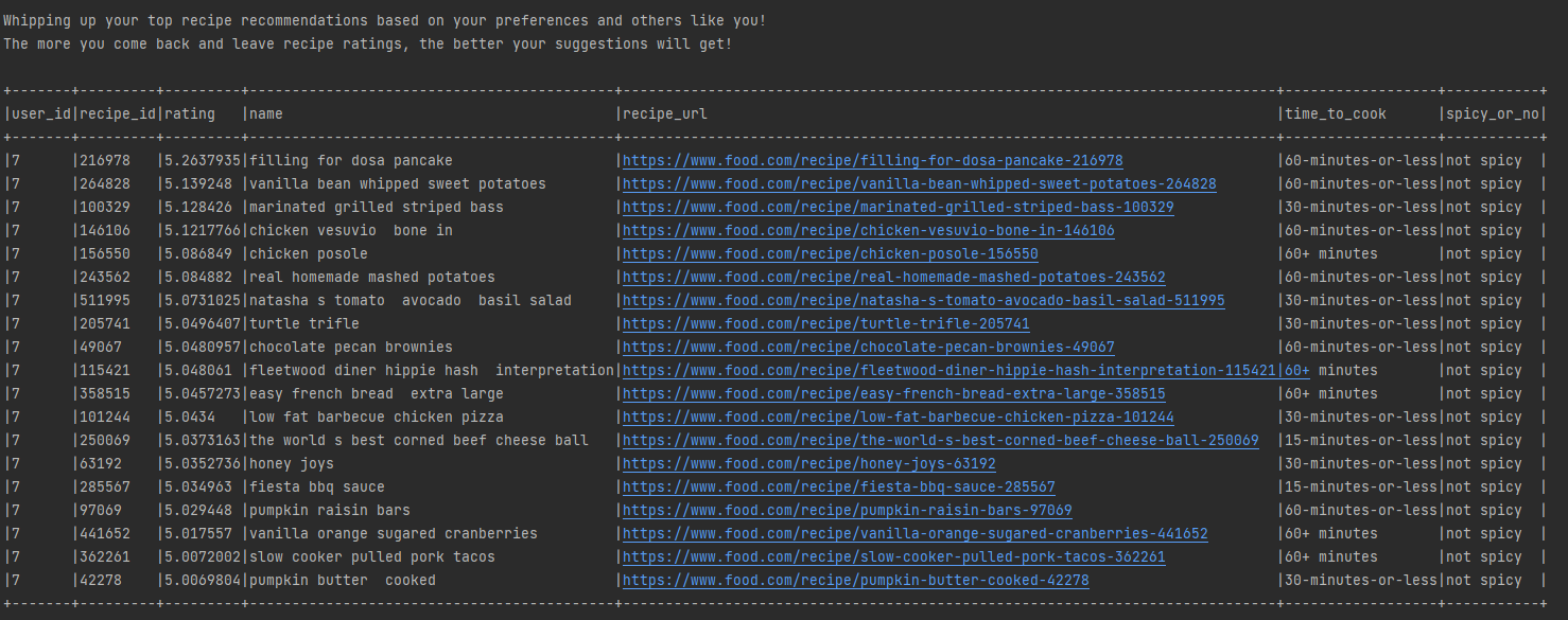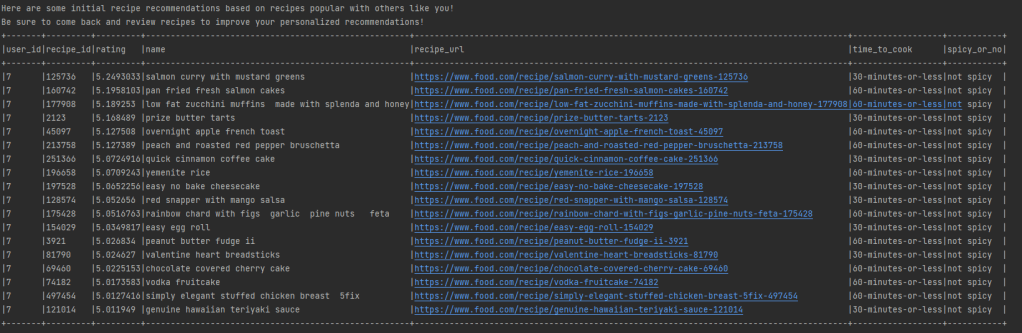 Nice! With the user providing this data, the trained model generates some initial recipe recommendations based on highly rated recipes of users with similar taste profiles. The user can browse the options and go straight to the full recipe on food.com!